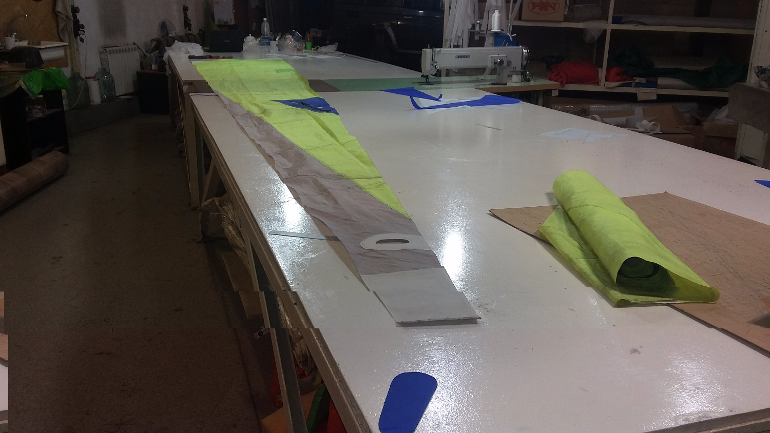сложности возникли с верхней обшивой. нужно было сшить 3 куска: кусок из нижней обшивы Лайтспида пошел на верхнюю часть, но он был короткий. серые части Комбата дополнили длину. и белая часть обшивы спорта . и вот тут кажется мы ошиблись. ткань Спорта была растянута слабее, чем верхняя часть. старались соединять идеально те же самые куски тряпки на оба полукрыла, потому что ткань потянута (для симметрии). для этого ставили репера на плазу, где именно находились латкарманы Спорта и края ткани. на верхней обшиве больше всего усилений. усиления под латы, причем там слой пленки плюс еще слой дакрона, усиление на лопух, на начало пришива нихней обшивы, под верхние троса ремень и т.д.