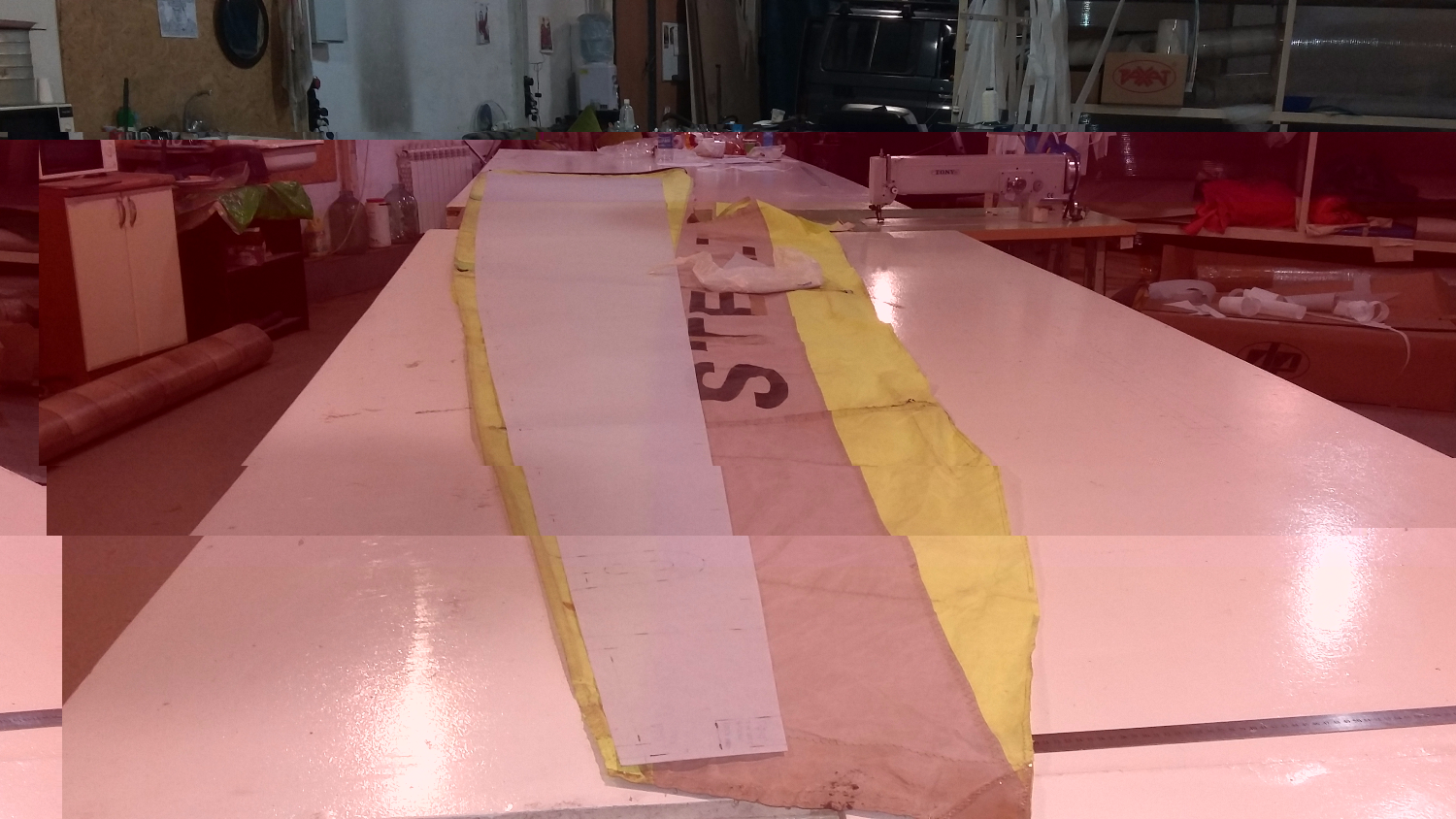 в первую очередь расставляются репера по всему полукрылу в месте соединения тканей. это такие крестики, одна линия - это линия пришива, а другая - линия, по которой потом ткани совмещаются, чтобы не сместились. мы ставили каждые 30 см, в местах изгиба 20 см.