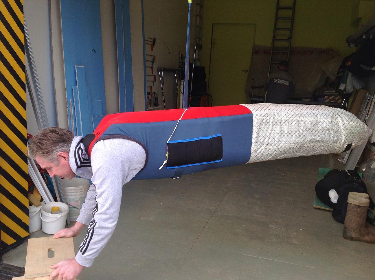 Парашют производство КДС МАИ, площадь 27м.кв., ткань F-111, вершина втянута. Фал парашюта крепится к пластине и ножным обхватам. Парашют не применялся.
