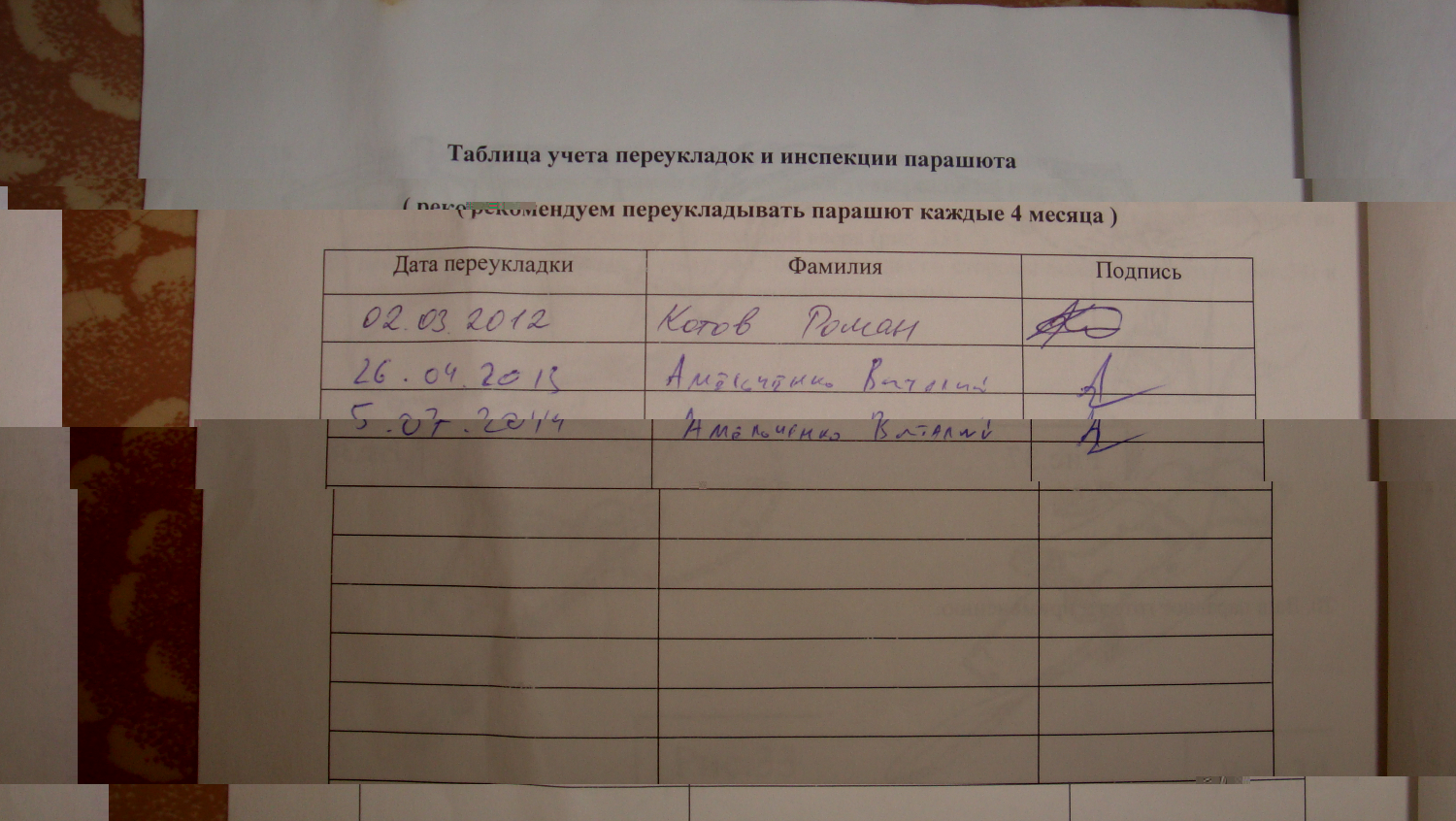 Паспорт (точнее инструкция) прилагается, все переукладки отмечались в отдельной графе