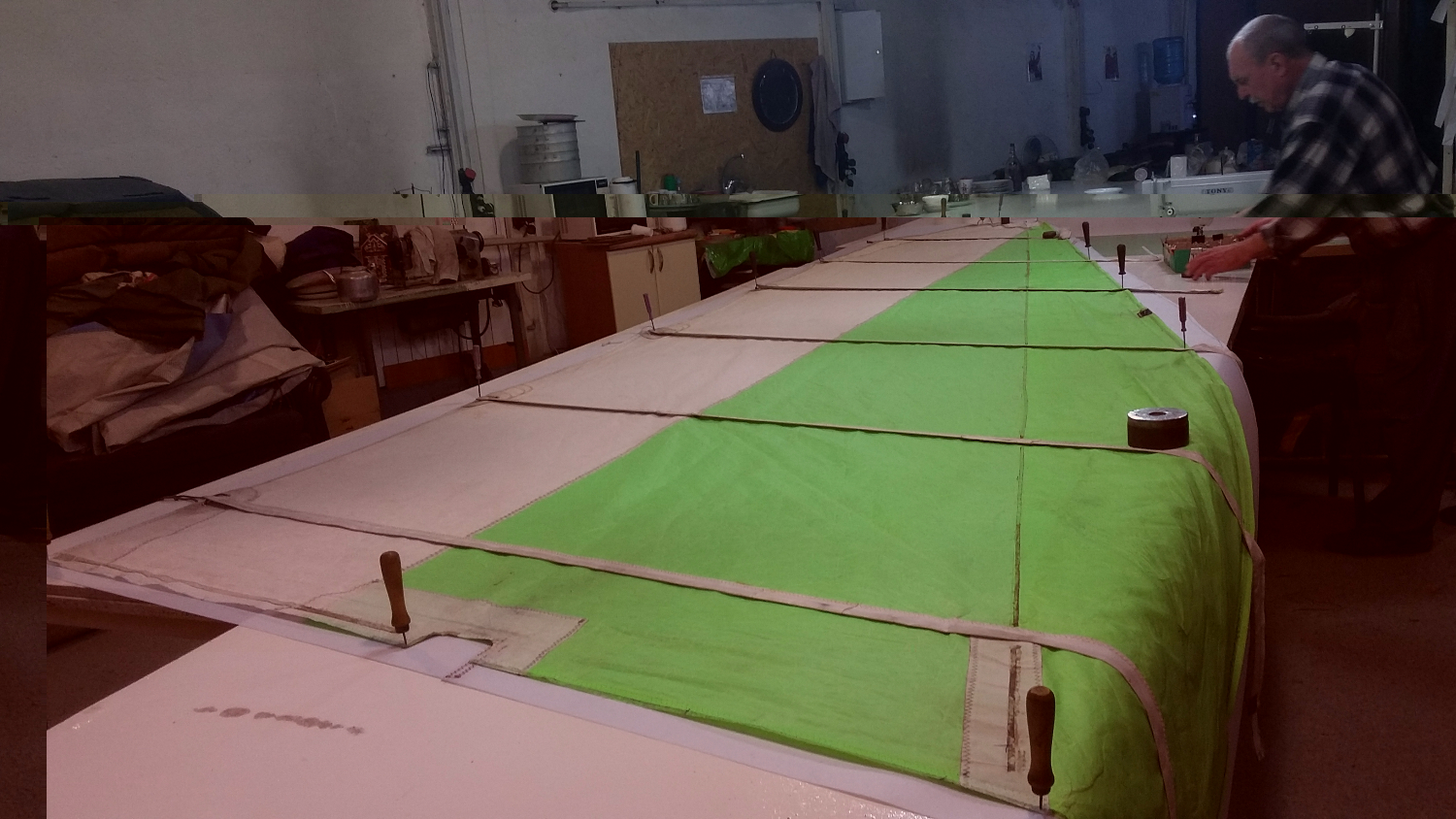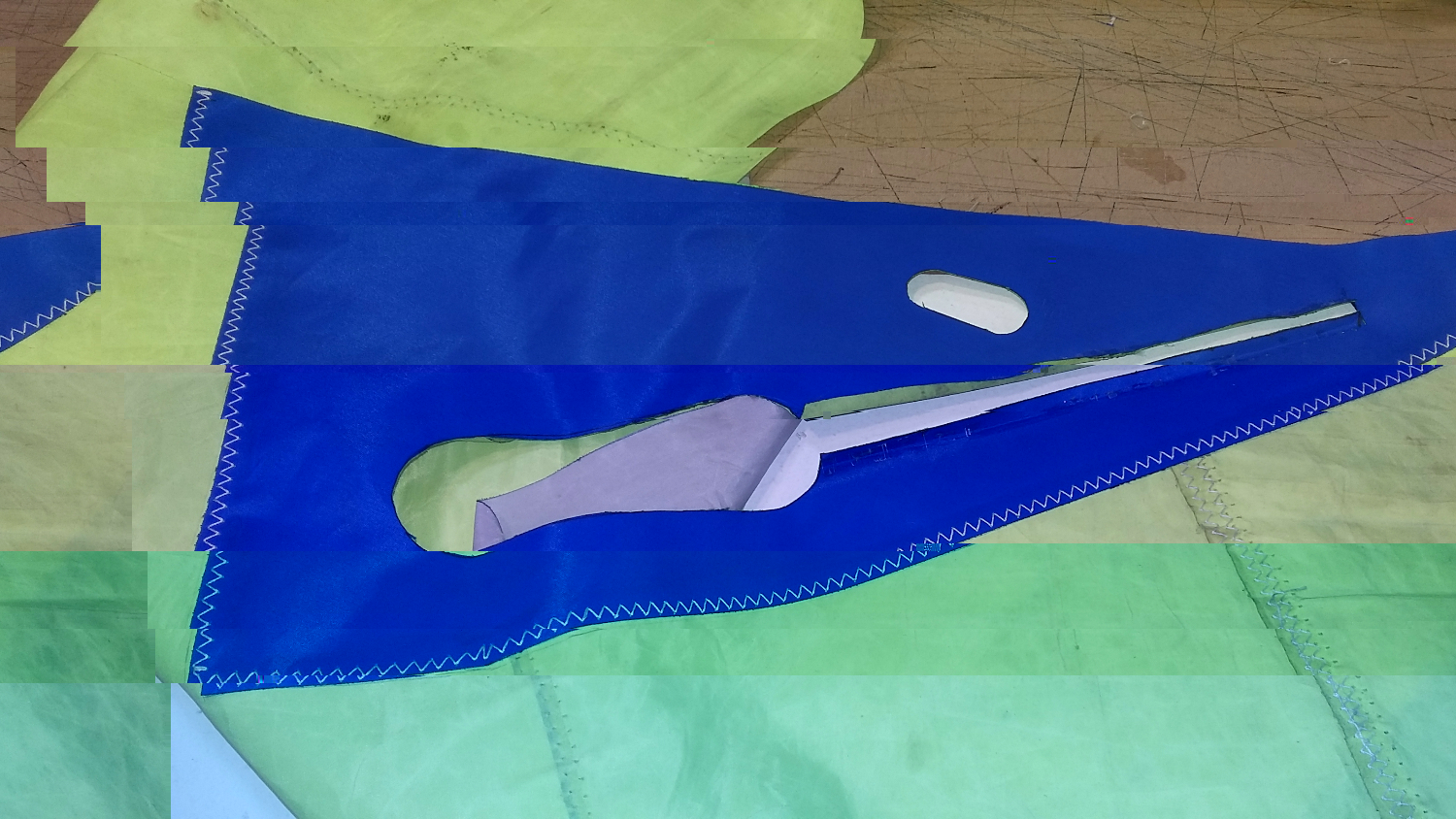 сложности возникли с верхней обшивой. нужно было сшить 3 куска: кусок из нижней обшивы Лайтспида пошел на верхнюю часть, но он был короткий. серые части Комбата дополнили длину. и белая часть обшивы спорта . и вот тут кажется мы ошиблись. ткань Спорта была растянута слабее, чем верхняя часть. старались соединять идеально те же самые куски тряпки на оба полукрыла, потому что ткань потянута (для симметрии). для этого ставили репера на плазу, где именно находились латкарманы Спорта и края ткани.