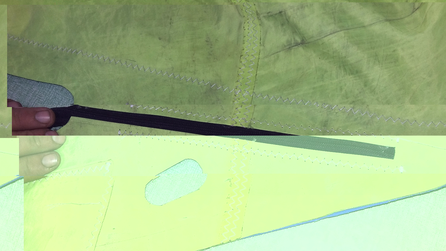 потом наружний обтекатель. очень важно срезать нитки с местах латкарманов (там естственно разрыв шва), а то мы на том парусе не срезали и латы упирались в них.