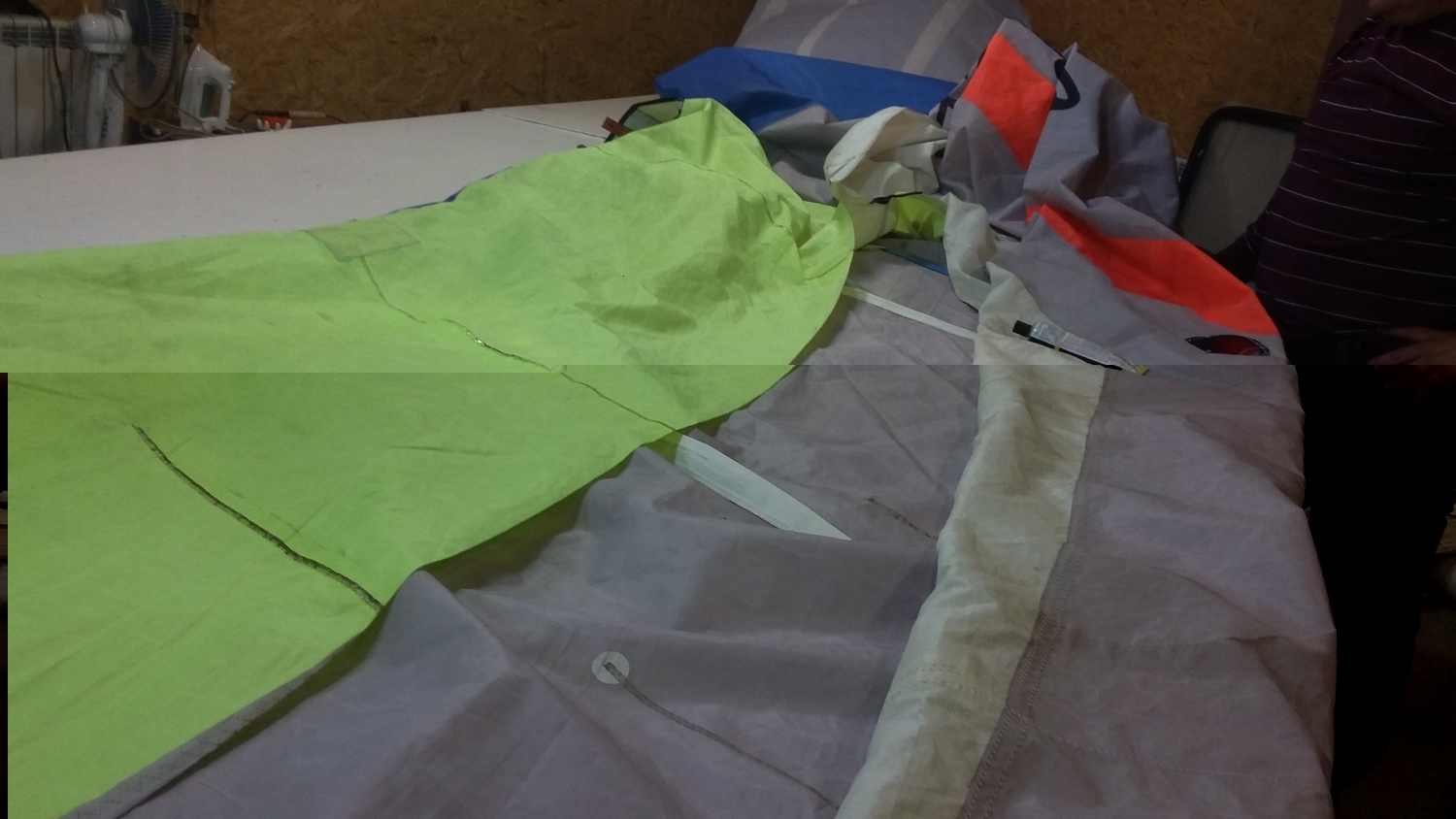 ну у бедного алматинского клуба не было новой ткани конечно же. зато на эксперименты было несколько старых крыльев. Спорт с убитыми нитками, распарывать который - одно удовольствие. а перешивать - дороже самого спорта. поплавленный сверху Комбат Стаса. и Ленкин Лайтспид с убитой вхлам верхней обшивой. еще у Игоря была какая-то запчасть от старого химического крыла. ну и были обрезки нового тяжелого дакрона на усиления, которые для моторажных крыльев вроде и не нужны уже.