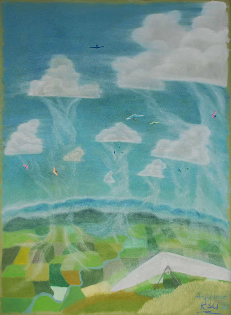 А вот сюжет такой: сочная зеленая равнина под аквамарином неба, и до самого горизонта - развитая кучевка высокими "шапочками", только это не просто облачка, а белые кроны деревьев, которые растут от самой земли, и видно стволы их и ветви, тянущиеся вверх и упирающиеся в облачные базы. Под облачками, естественно, дельтапланчики, и один белоснежный стоит и сияет на земле неподалеку, а вокруг всеобщее счастье и гармония ;)